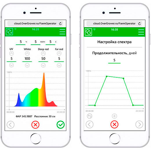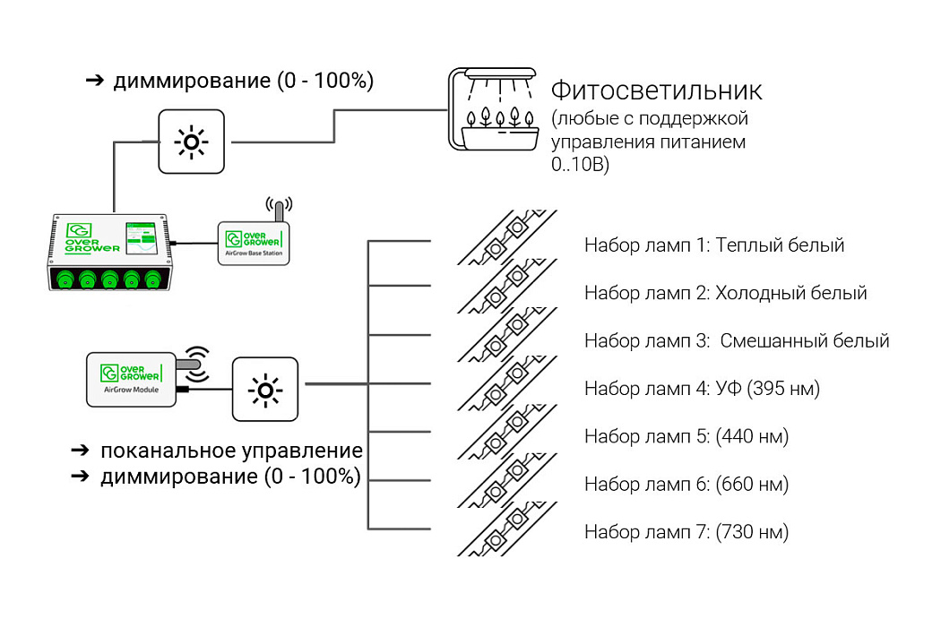 Под управлением Комплекса автоматизации OverGrower доступно прямое управление регулируемым источником света для воссоздания необходимого времени года, циклов роста и фотобиологических реакций.