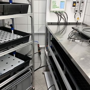 В этой небольшой лаборатории один прибор OverGrower управляет выращиванием сразу в двух зонах одновременно - проращивание семян и выгонка до стадии рассады и доращивание растений до технической зрелости.